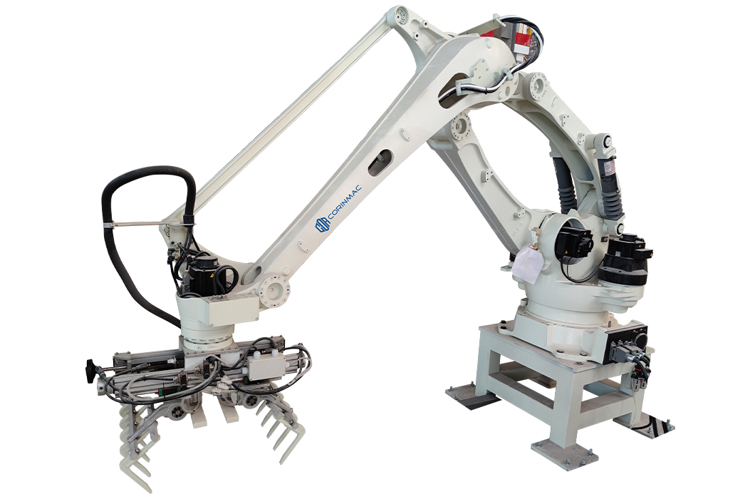 The reverse operation of palletizing is depalletizing. In this operation, the robot removes objects from the pallet and transfers them to a conveyor or machine for further processing. Today, robotization of CNC machines is becoming more widespread, in which a robot takes blanks from a pallet, places them into a machine, after processing, grabs finished products, takes them out of the machine and places them on another pallet.