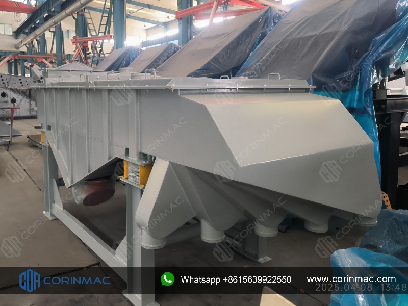 The material enters the sieve box through the feeding port, and is driven by two vibrating motors to generate the exciting force to throw the material upward. At the same time, it moves forward in a straight line, and screens a variety of materials with different particle sizes through a multilayer screen, and discharge from the respective outlet. The machine has the characteristics of simple structure, energy saving and high efficiency, and fully enclosed structure without dust overflow.