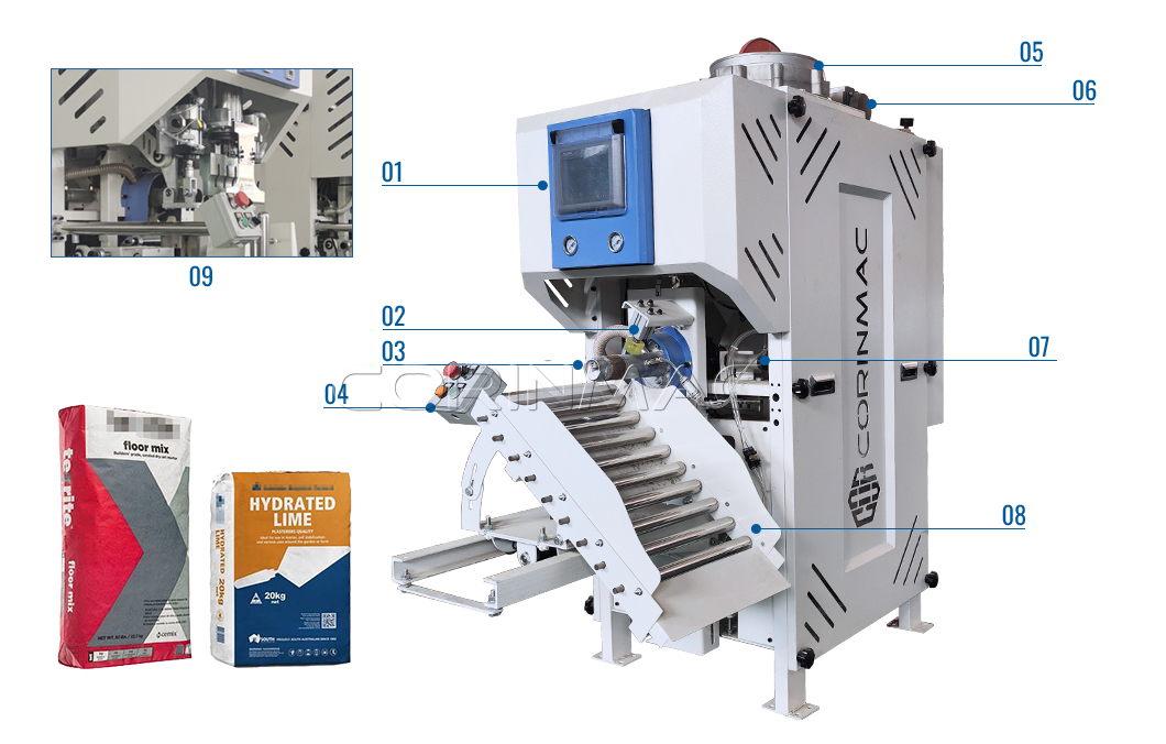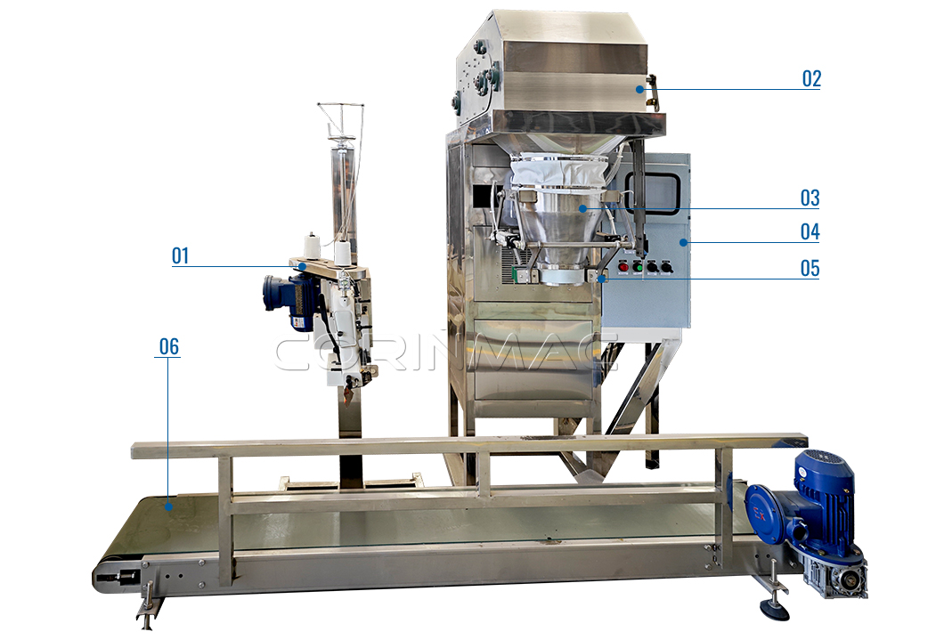 01,Sewing sealer 02,Weighing hopper 03,Bag mouth 04,Control cabinet 05,Clamp bag cylinder