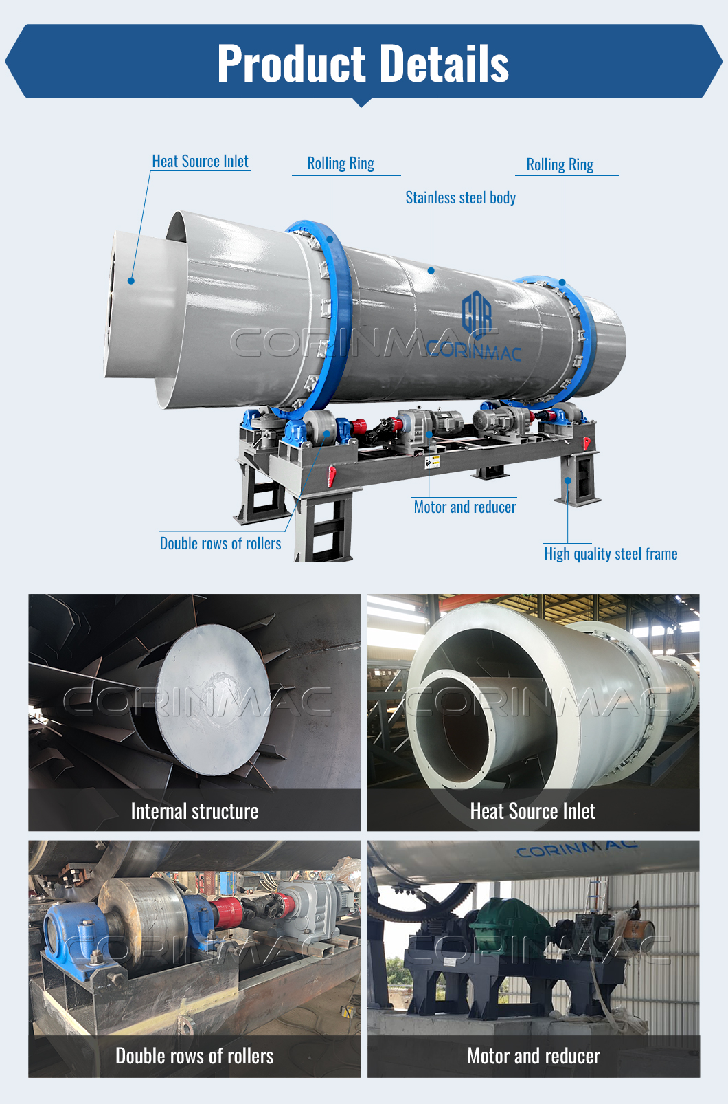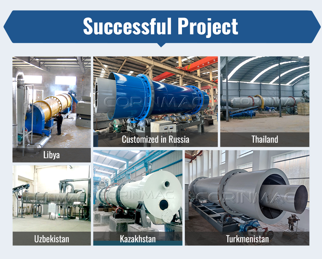The wet materials that need to be dried are sent to the feeding hopper by a belt conveyor or a hoist, and then enter the material end through the feeding pipe. The slope of the feeding tube is greater than the natural inclination of the material, so that the material can enter the dryer smoothly. The dryer cylinder is a rotating cylinder slightly inclined from the horizontal line. The material is added from the higher end, and the heating medium is in contact with the material. With the rotation of the cylinder, the material moves to the lower end under the action of gravity. In the process, the material and the heat carrier exchange heat directly or indirectly, so that the material is dried, and then sent out through a belt conveyor or a screw conveyor.
