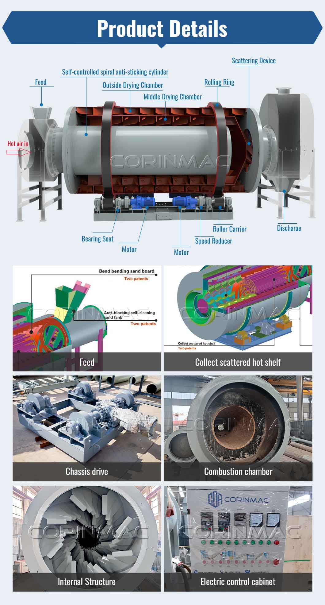 The three cylinder drum dryer (three-pass) adopts a embedded structure, which is formed by embedding three concentric cylinders (inner cylinder, middle cylinder, and outer cylinder) of different diameters to form a circular cylinder with circular heat preservation, which improves the drying efficiency. Reduced gas (fuel) consumption. The cylinder is equipped with lifting plates and guide plates of different angles and spacings. These lifting plates and guide plates can ensure that the material to be dried moves in the direction of the cylinder's movement under the action of gravity, and keep the material in the cylinder with a sufficient residence time and adequate clearance. The length of the cylinder is only one third of the single cylinder dryer, thereby greatly reducing the floor space and the building construction area.