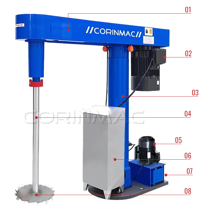 01. Host rack 02. Main motor 03. The main engine shaft hydraulic lifting, lifting stroke 1.1M-1.6M 04. Stainless steel dispersion shaft 05. Hydraulic motor 06. Control the electric box 07. Hydraulic oil tank 08. Stainless steel dispersion plate